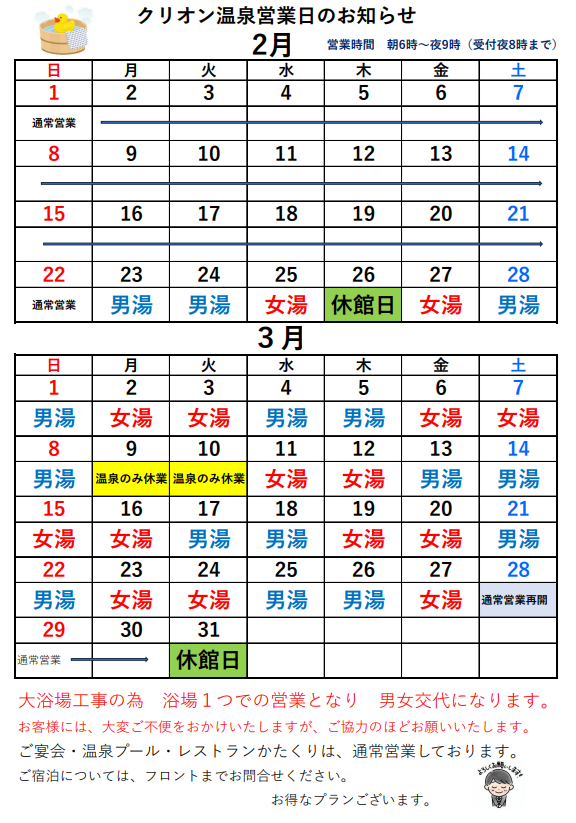 大浴場工事に伴い【クリオン温泉営業日