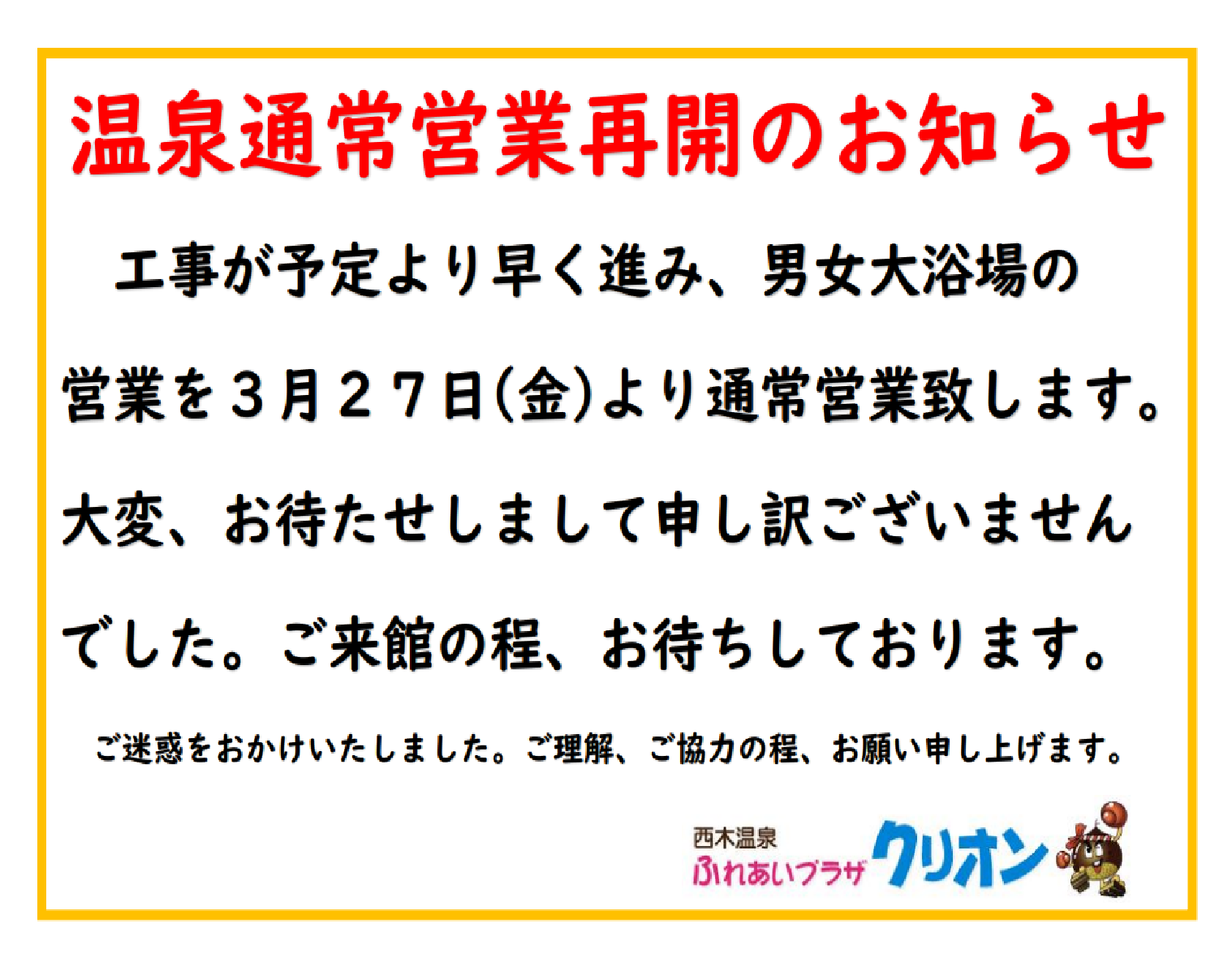 【温泉通常営業再開のお知らせ】